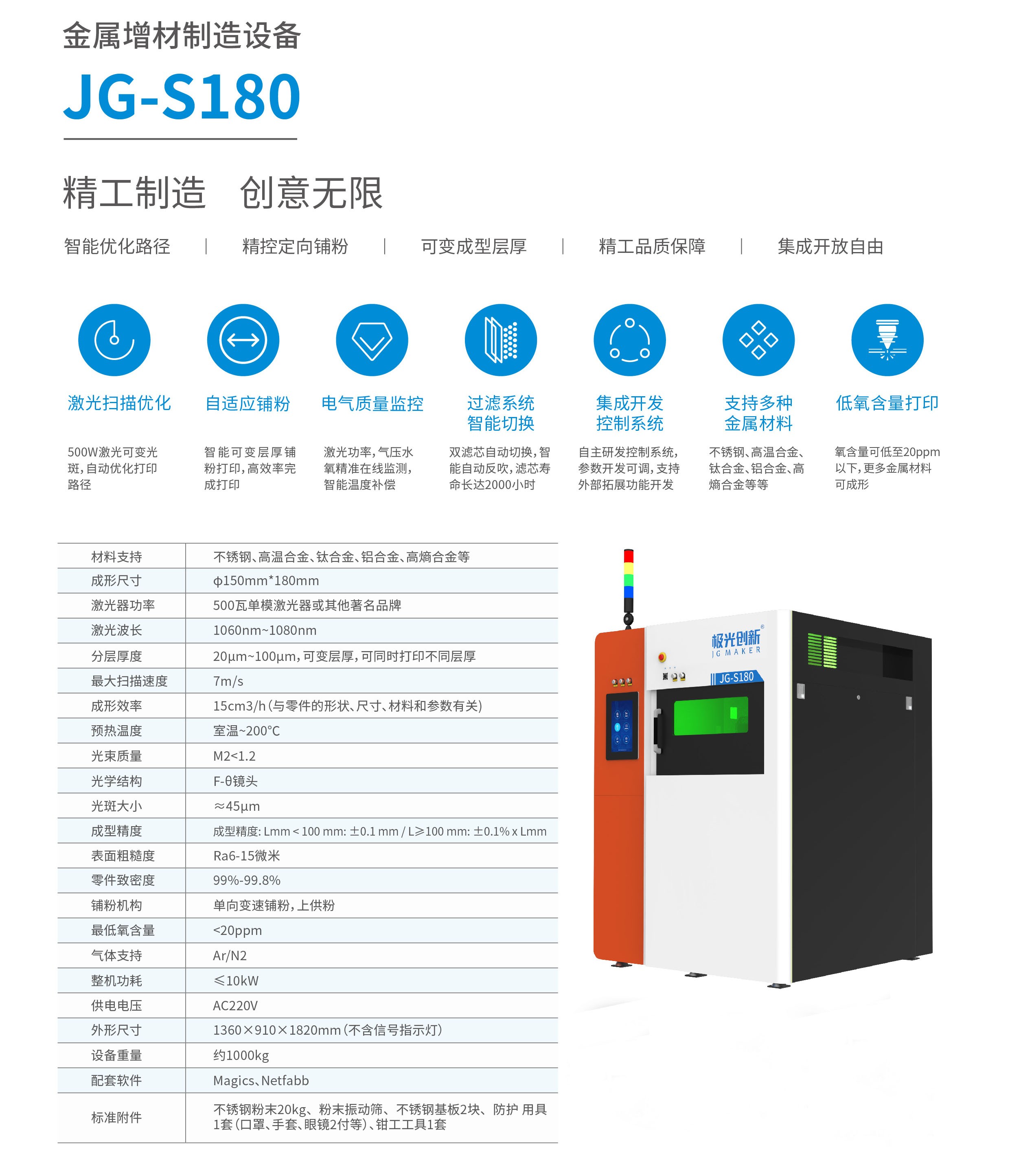 金屬增材制造設(shè)備,500W激光可變光斑,自動(dòng)優(yōu)化打印路徑,自適應(yīng)鋪粉,自主研發(fā)控制系統(tǒng),支持多種金屬材料,低氧含量打印,更多金屬材料可成型